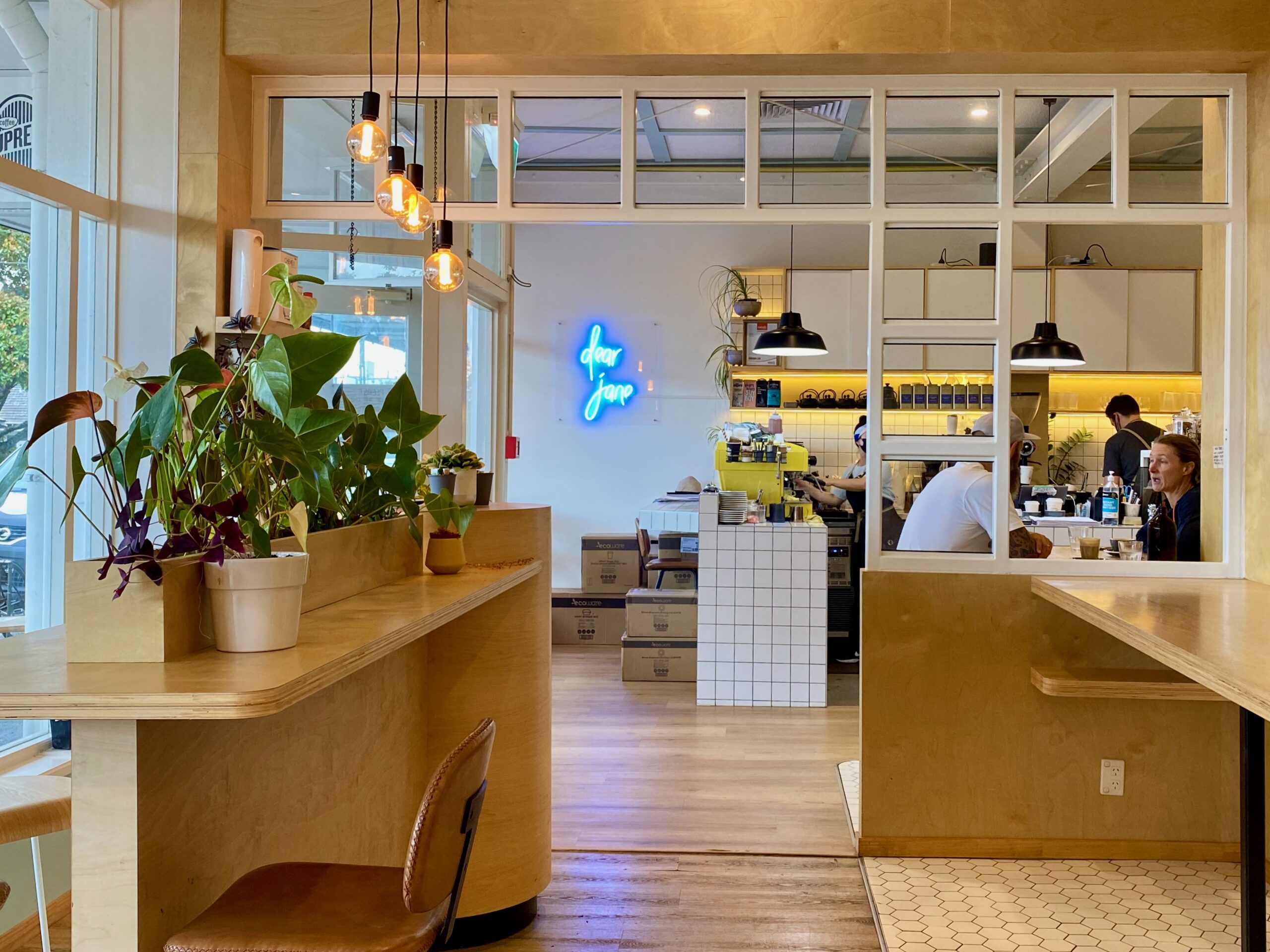 Dear Jane – A neighbourhood cafe filled with bright light, green plants, and plywood tables.